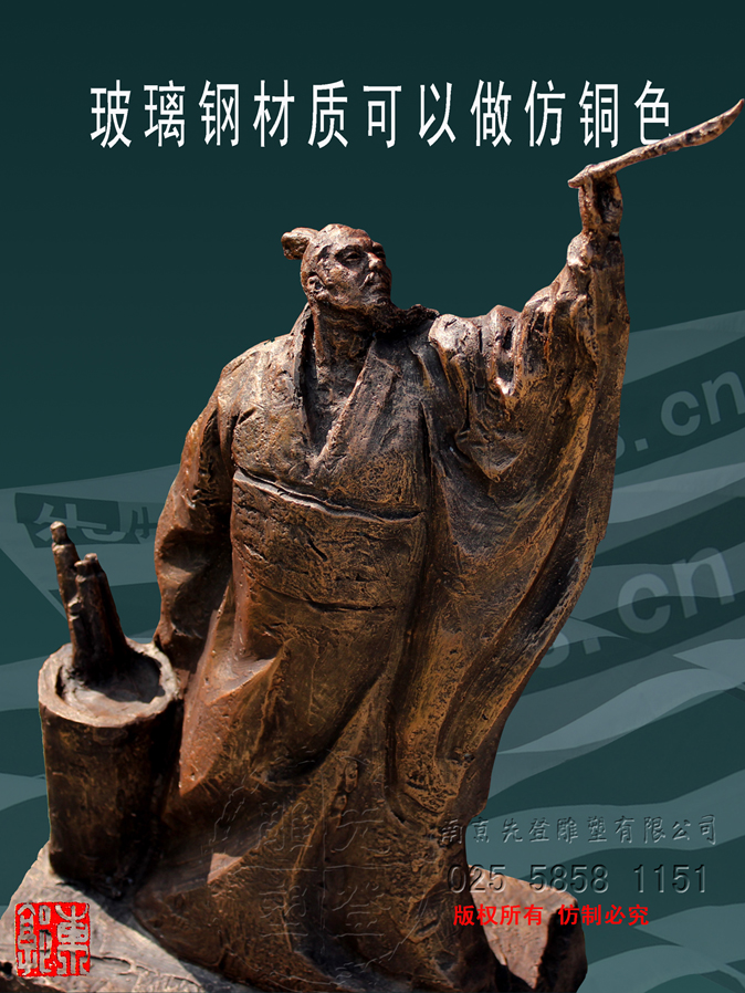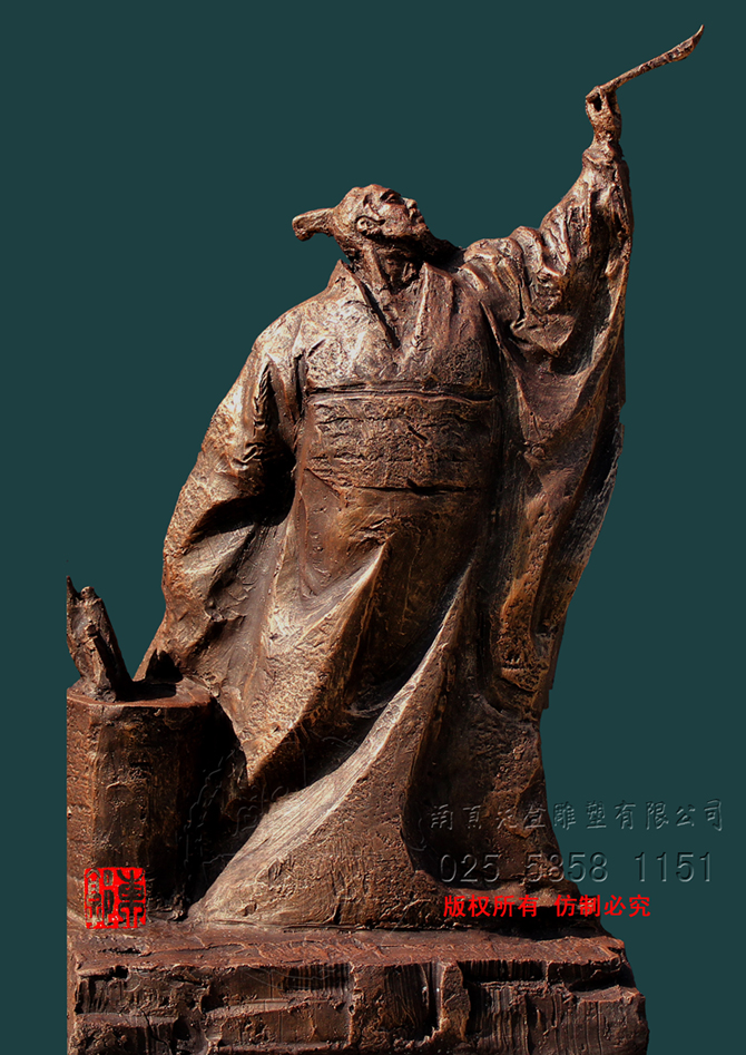 張芝字伯英,出生官宦之家,幼時(shí)高操,勤習(xí)學(xué)書(shū),朝廷賞識(shí),令他做官,而他并非貪圖高官厚祿,甘做布衣。素日臨池學(xué)書(shū),得崔杜之法,復(fù)而變之,遂成“今草”。張芝對(duì)書(shū)藝癡醉令人驚嘆。衛(wèi)恒《四體書(shū)勢(shì)》里有言“凡家之衣帛,必先書(shū)而后練之。臨池學(xué)書(shū),池水盡墨。”張芝對(duì)于書(shū)法藝術(shù)的不斷索求,終成一代“草圣”,當(dāng)是“為世所寶,寸紙不遺”。雕塑里張芝如平日習(xí)作,但見(jiàn)他揚(yáng)手,握管,在虛空中縱姿揮毫,一如其書(shū)法,一筆而就,不拖沓凝滯,衣袍素袖宛如字之體勢(shì)婉轉(zhuǎn)流暢,舒箋觀鳥(niǎo)跡,研墨染魚(yú)緇。