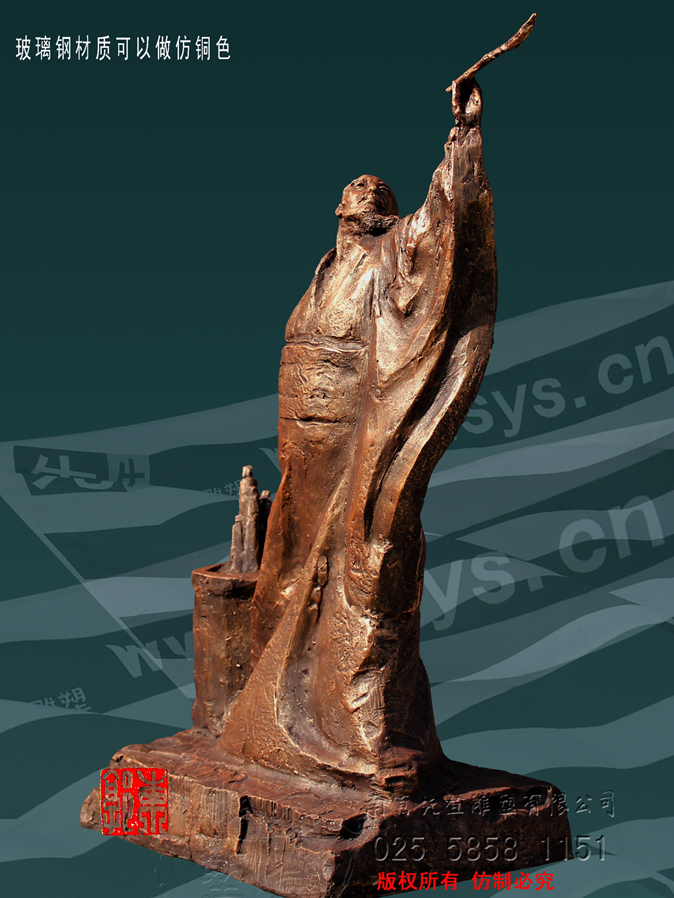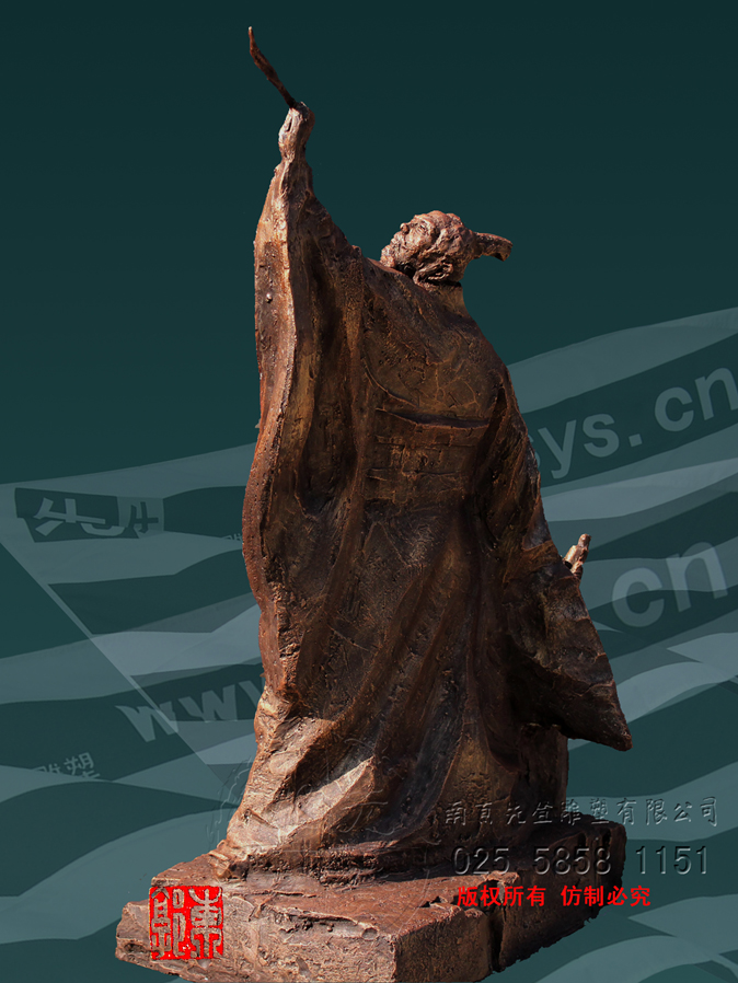 張芝日復(fù)如是,墨池水染,而筆法精湛,雕塑中東郭先生作得人物身后立有一口水甕,代指墨池,身側(cè)為書(shū)卷參差錯(cuò)落,不復(fù)你從何角度,都自成一番風(fēng)景,似有不容于世,不饗物之芳華,身在日月山川之外。都言,字若其人,觀其字,當(dāng)是一筆所成,偶有不連,而血脈不斷,字跡氣脈相通,成山川險(xiǎn)象。但又看先生雕塑,筆墨有無(wú)間,衣緇素縷暗藏儂華,轉(zhuǎn)載沉浮里,風(fēng)華涌動(dòng),通了天地的氣運(yùn),又通曉世間閭閻,真是出塵入世,字若人,行走在了日月山川里。真是人與山河并立。
