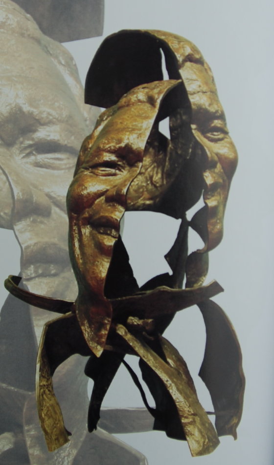 細看薛林納為名人制作的頭部塑像中,盡管各不相同,各有特色,但有一個共同的“薛林納語言”,那就是這樣名人的臉部大多從中央一劈為二,分成左右兩爿,愛因斯坦、畢加索、亨利·摩爾、曼德拉都有被分裂,被扭曲的形象。或許,薛林納想告訴大家,即使是偉人的人物,他們的性格也有兩面性;他們的左傾和右傾思想常常合二為一,卻又相對獨立;他們有成功光亮的一面,也有失敗困擾的一面。而這,才是完整的人生,才是他們真正的面貌。